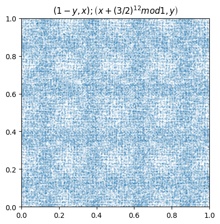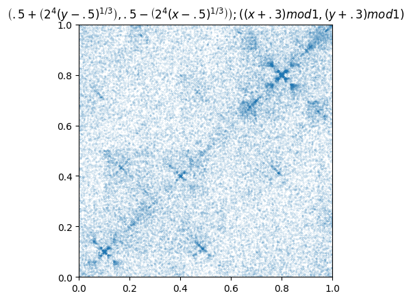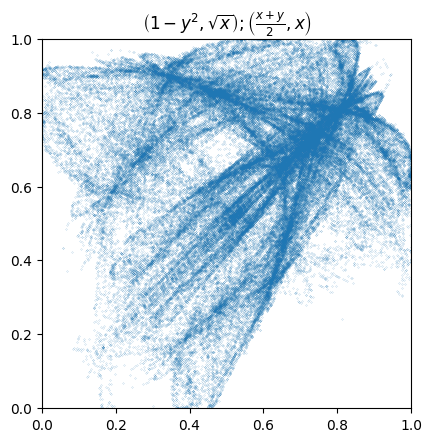 - Take two moderately interesting functions that map the unit square to itself; for example, \[(x,y) \rightarrow \left(1-y^2, \sqrt{x}\right)\] and \[(x,y) \rightarrow \left(\frac{x+y}{2}, x\right)\].