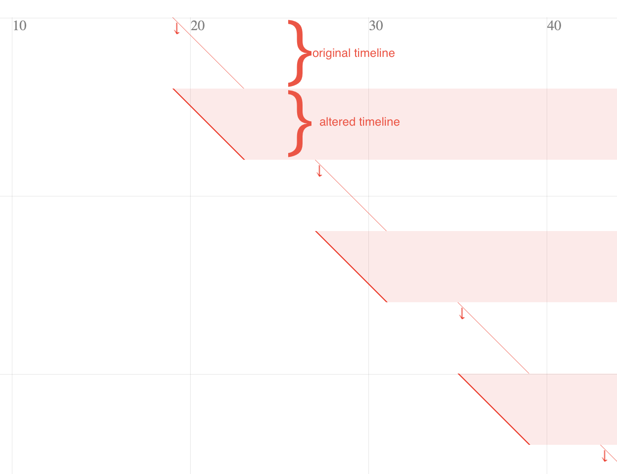An example: suppose, when it's "Jan 18" in the top timeline (call it TL-0), there's some sort of bloody revolution, so, on Jan 19, somebody in that timeline ("Arnold-0"), naturally, wants to travel back in time to prevent it. He can travel "back in time" by going down to the timeline that's lagging four days behind him (call it TL-4):