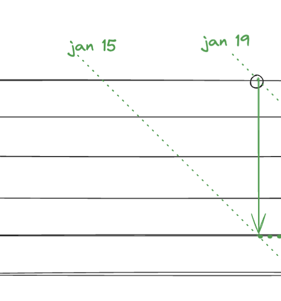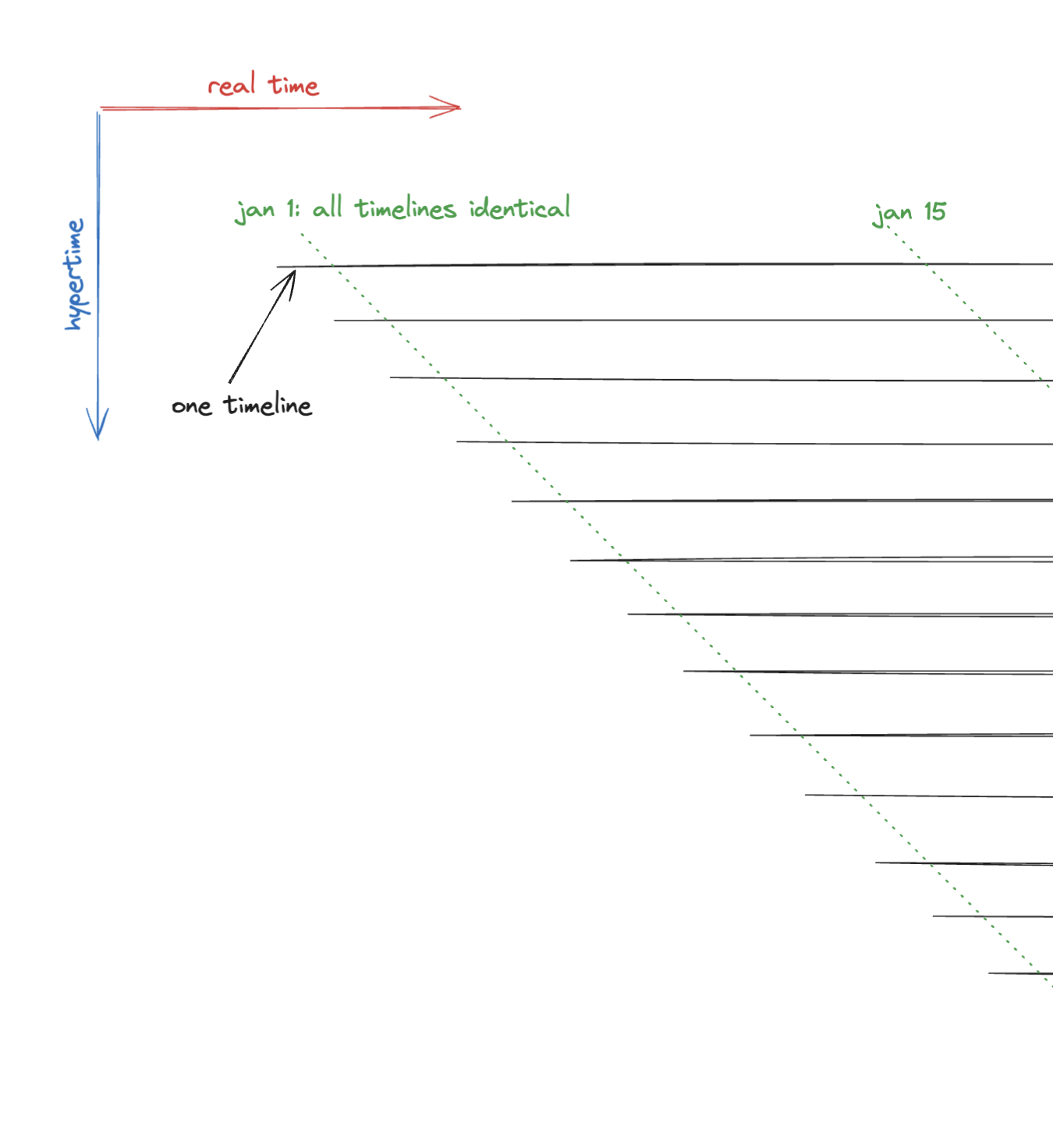 The idea is that there's a bunch of initially-identical timelines, each one a (nearly) closed, deterministic system, each following an identical deterministic path through time; but they were initialized at slightly different times, so they're offset slightly from each other. You can visualize this as a stack of horizontal lines, each horizontal line being a timeline, and "calendar times" like "Jan 1" being diagonal: