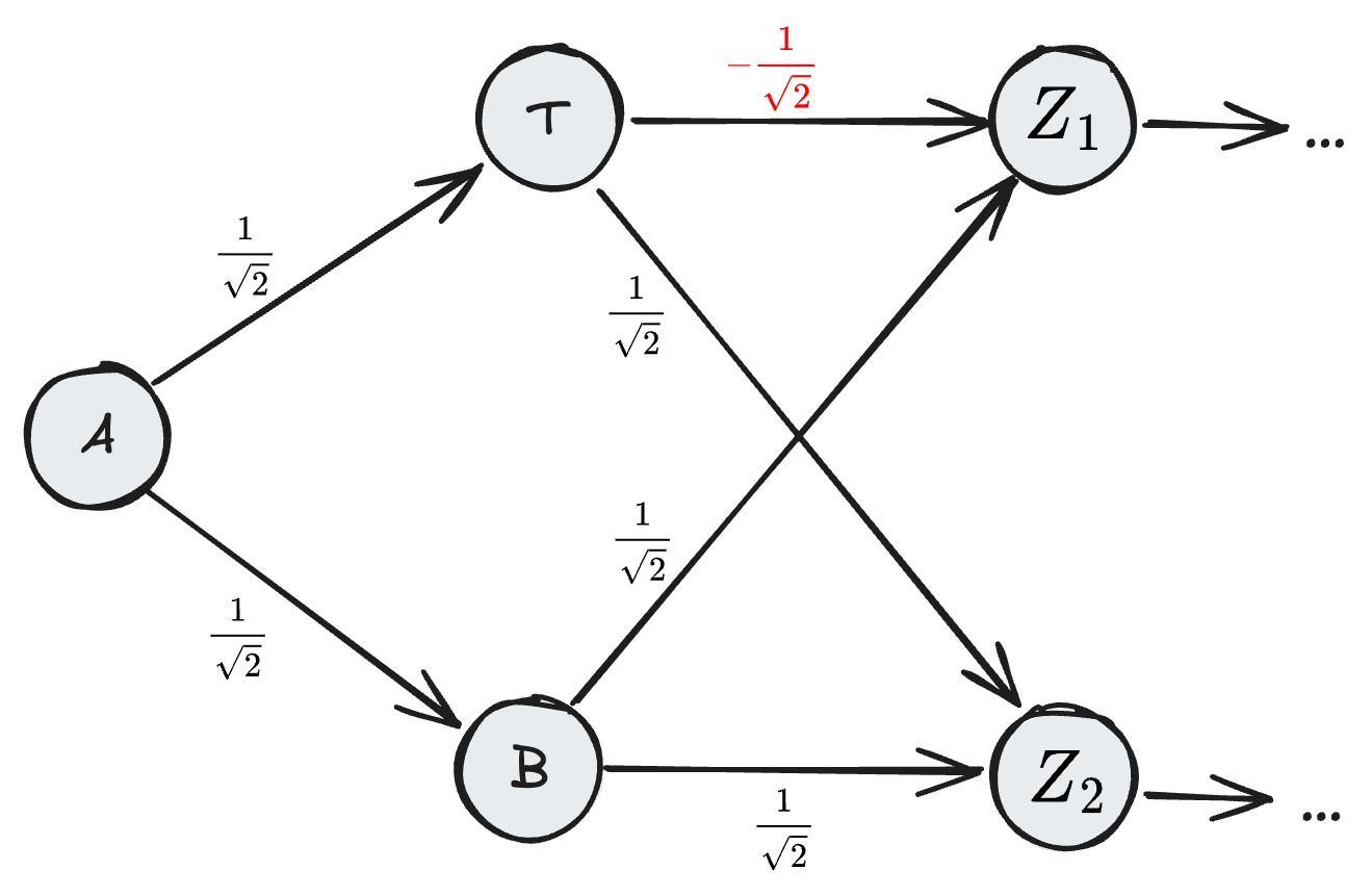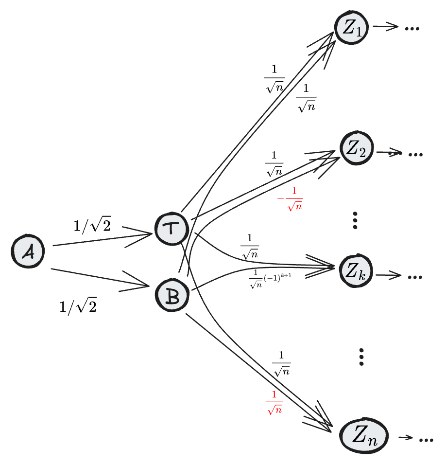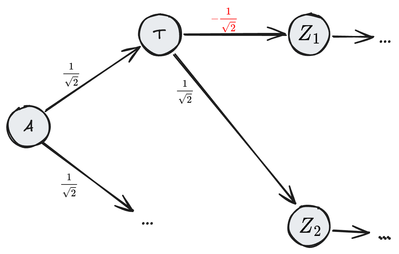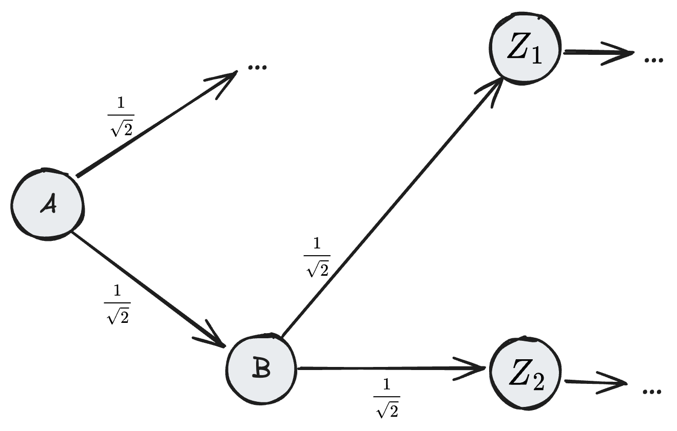 Exercise: in system (3) above, again starting in state \(A\): what can you say about the coefficients of the basis-states downstream of \(Z_1\), for \(t>2\)? (Assume that \(Z_1\) and \(Z_2\) share no descendants; the universe forks off in two completely different directions at that point.) (Solution.)