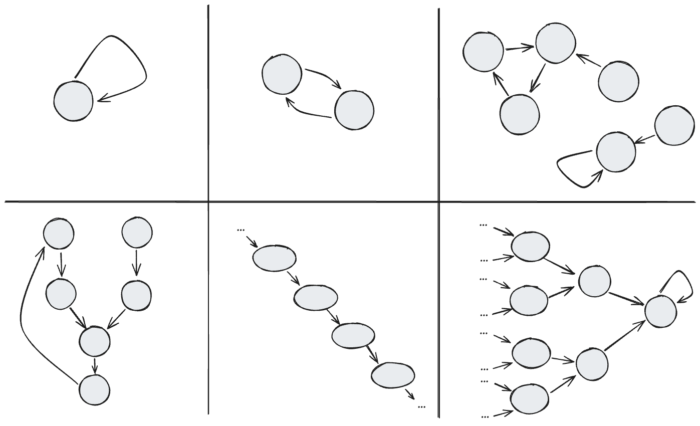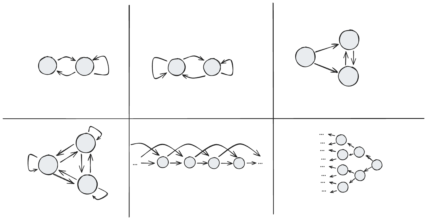 (Left to right, top to bottom: a system with one state which it's stuck in; a system that flip-flops between its two possible states; doodling; doodling; a system with an infinite number of states, 'cause why not; and another one with infinite states, just with a more interesting structure.)