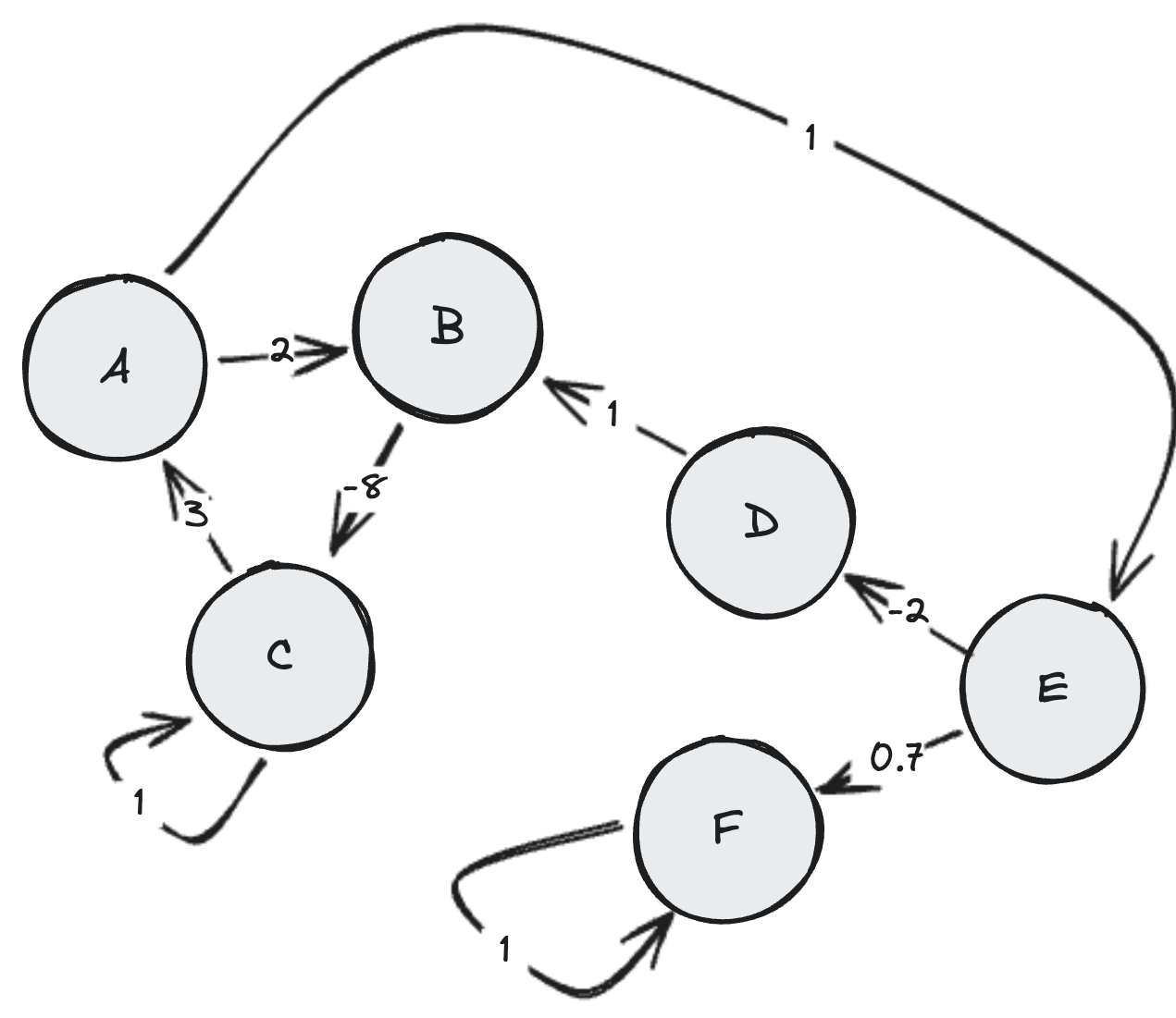 The dynamics of this system are also somewhat more complicated: rather than being a simple function \({A..F} \to {A..F}\), it's now a linear function on states, which we might depict like so: