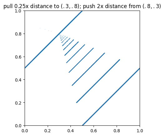 It takes a bit of care to find an interesting pair of functions: most simple pairs of functions tend to produce very uninteresting attractor-patterns, because there's a point, or a small set of discrete points, that are invariant under both functions, and so you very quickly end up trapped in that set. Like...