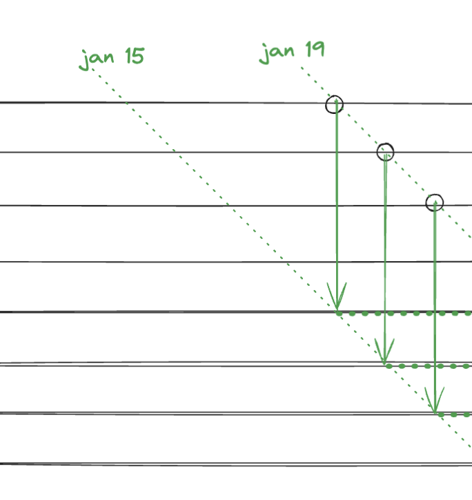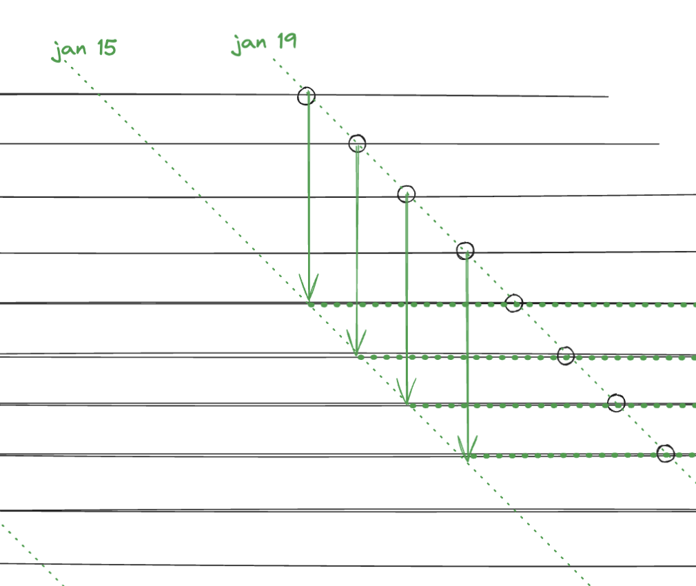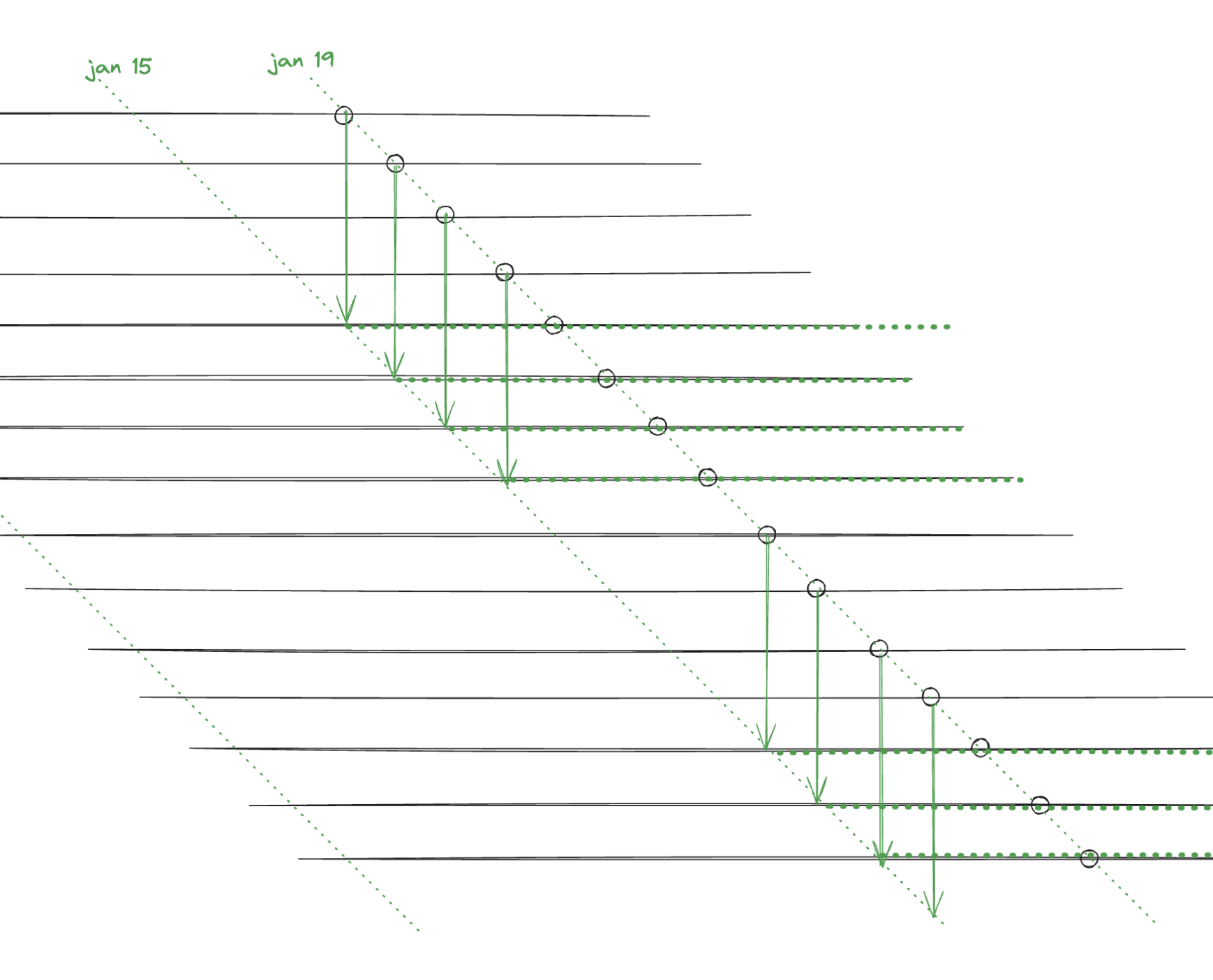 The idea is that there's a bunch of initially-identical timelines, each one a (nearly) closed, deterministic system, each following an identical deterministic path through time; but they were initialized at slightly different times, so they're offset slightly from each other. You can visualize this as a stack of horizontal lines, each horizontal line being a timeline, and "calendar times" like "Jan 1" being diagonal:
