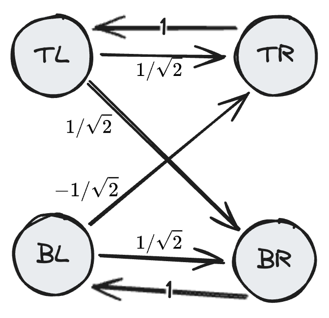 I've contrived for this post to only deal with real numbers; God isn't so kind. In the real world, these diagrams would sometimes have edge-weights like \(i/\sqrt{2}\), and, therefore, the basis-state-coefficients that make up a state would often be complex. For example, the last diagram above might instead have weights like...